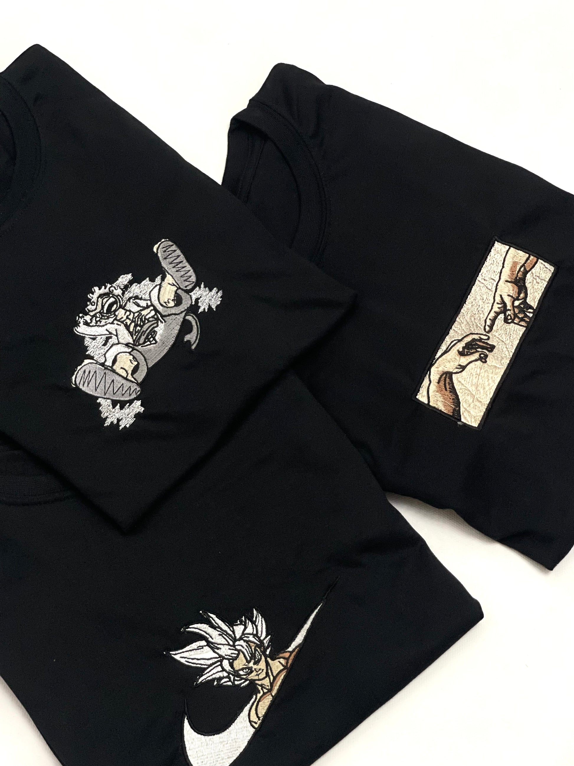 A legendary trio of art, adventure, and anime – this 3-pack features Creation of Adam, Luffy – One Piece, and Goku x Nike oversized embroidered tees, built for standout comfort and iconic streetwear appeal.