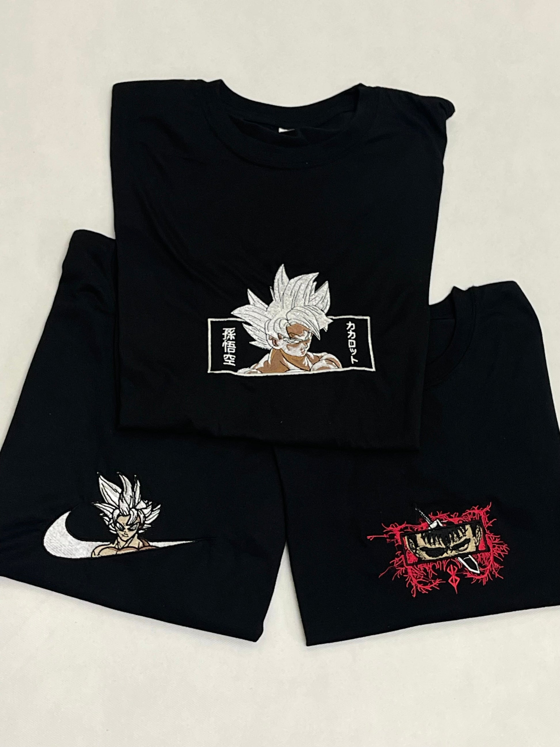 A fusion of strength, chaos, and style — this 3-pack of Goku x Nike, Berserk Eyes, and classic Goku oversized embroidered tees delivers anime impact with premium streetwear quality.